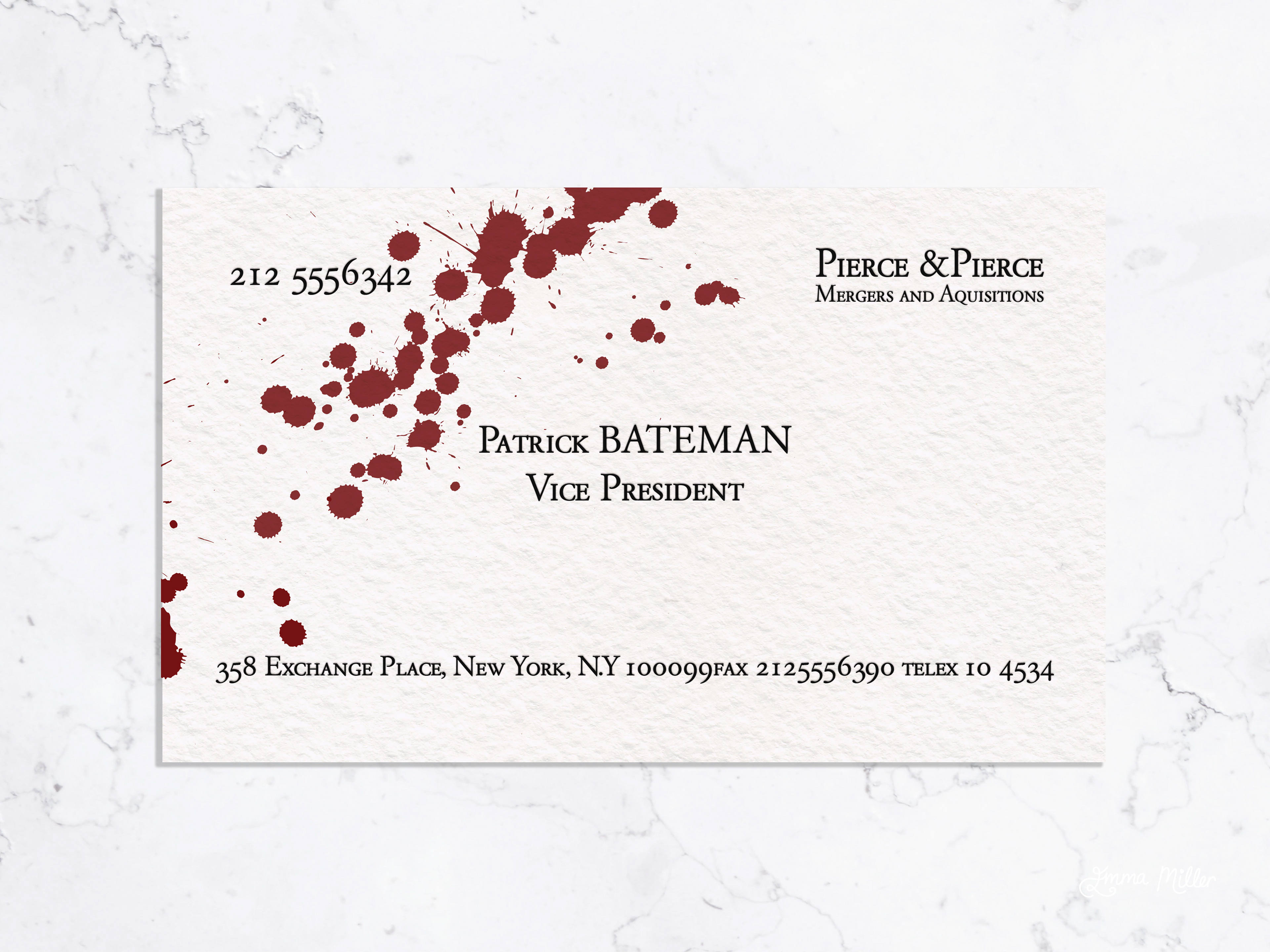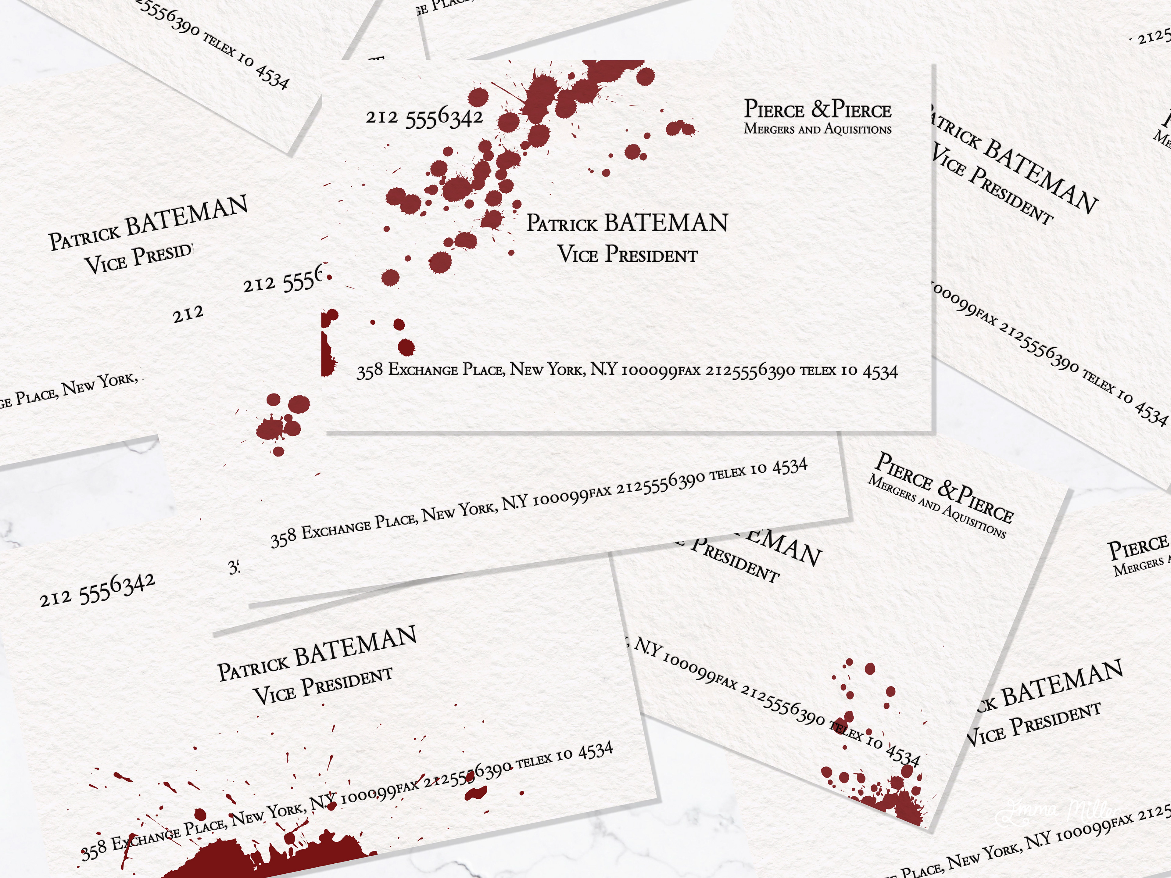 I never watched scary movies until I was in my thirties, but determined to become braver in life as well as in my viewing habits I began expanding my cinematic experienced with hubby Jon's hand in mine. Quite tightly I might add! American Psycho was one of the first horror films I ever saw. Patrick Bateman is a fictional character created by novelist Bret Easton Ellis. He is the protagonist and unreliable narrator of Ellis's 1991 novel American Psycho and is played by Christian Bale in the 2000 film adaptation of the same name. Obsessed with status and power he is competitive in all the worst ways, and also deeply insecure despite his lack of self awareness. His insecurities are borne out in his embrace of capitalist ideals, none of which quite hit the mark, including having the best business card. This pattern is my fun little tribute to an excellent film!
