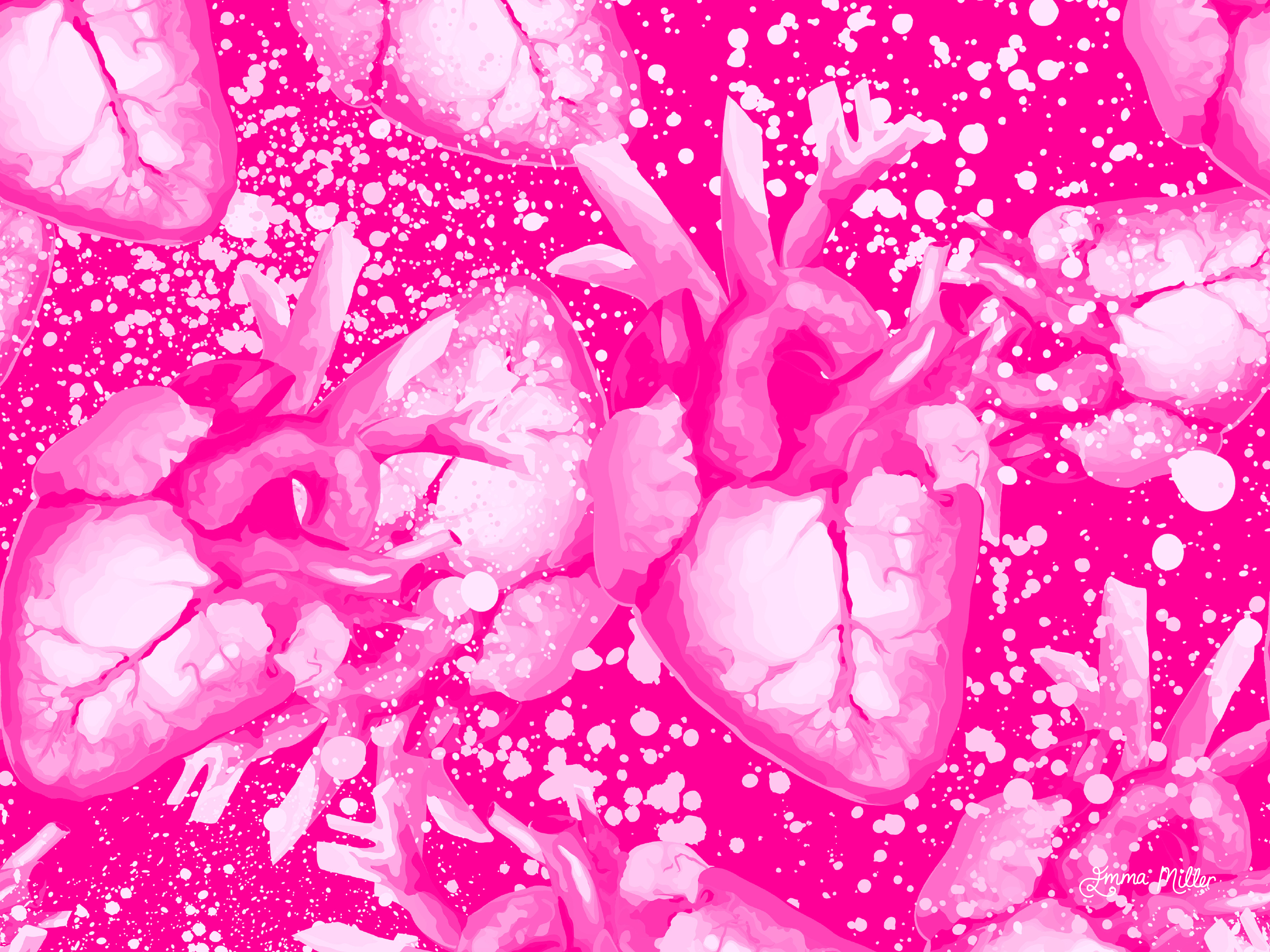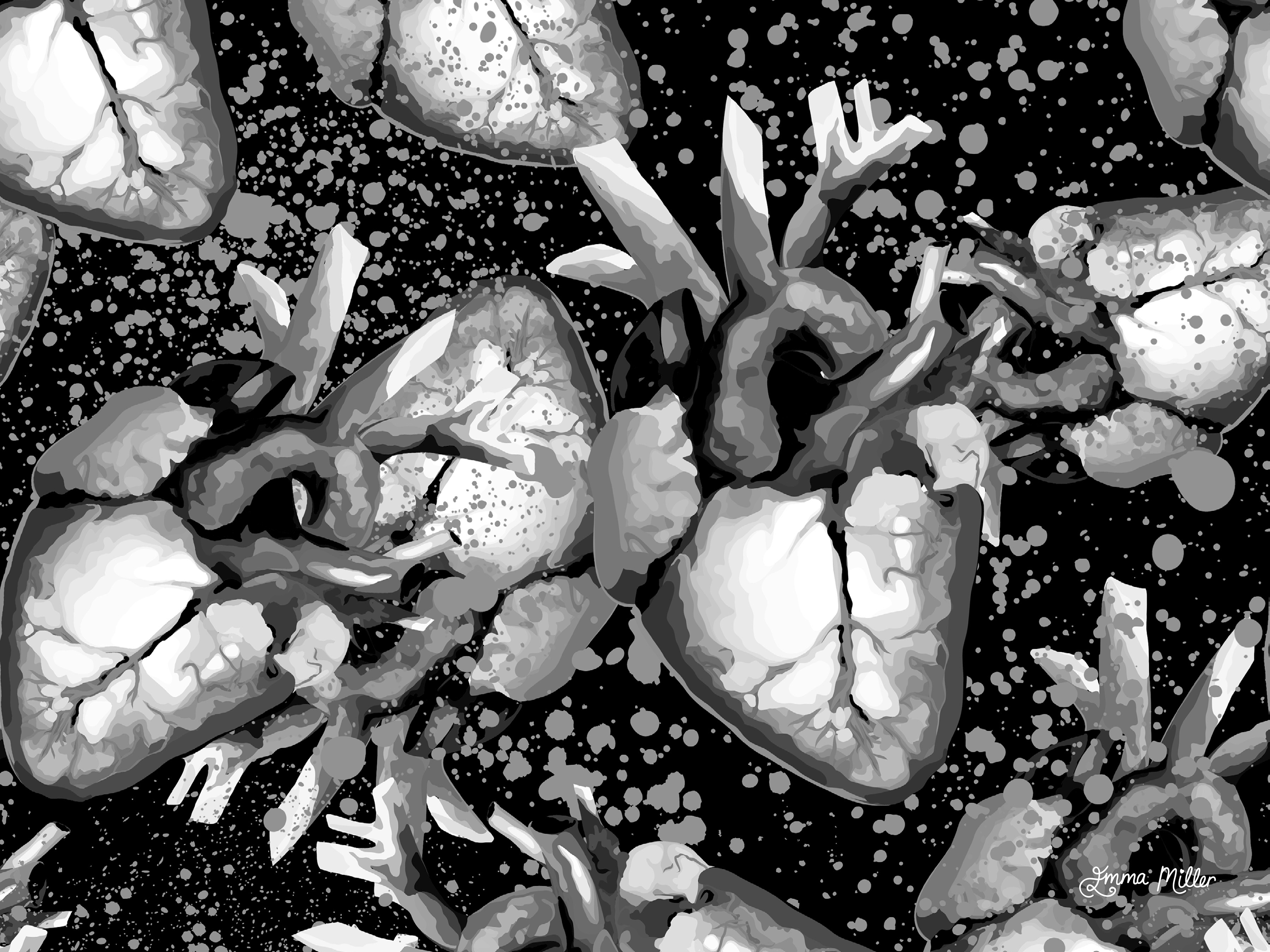 This pattern started life as a watercolour painting. I was experimenting with different textures to create an anatomical heart which looked pleasing to the eye but also a little realistic and messy in appearance. The original was lovely, but far to small to use as a base file for scaleable patterns, so I painstakingly redrew it in vector format to create this delightful chaos! I plan to makeĀ a dress with it one day! Watch this space for updates!