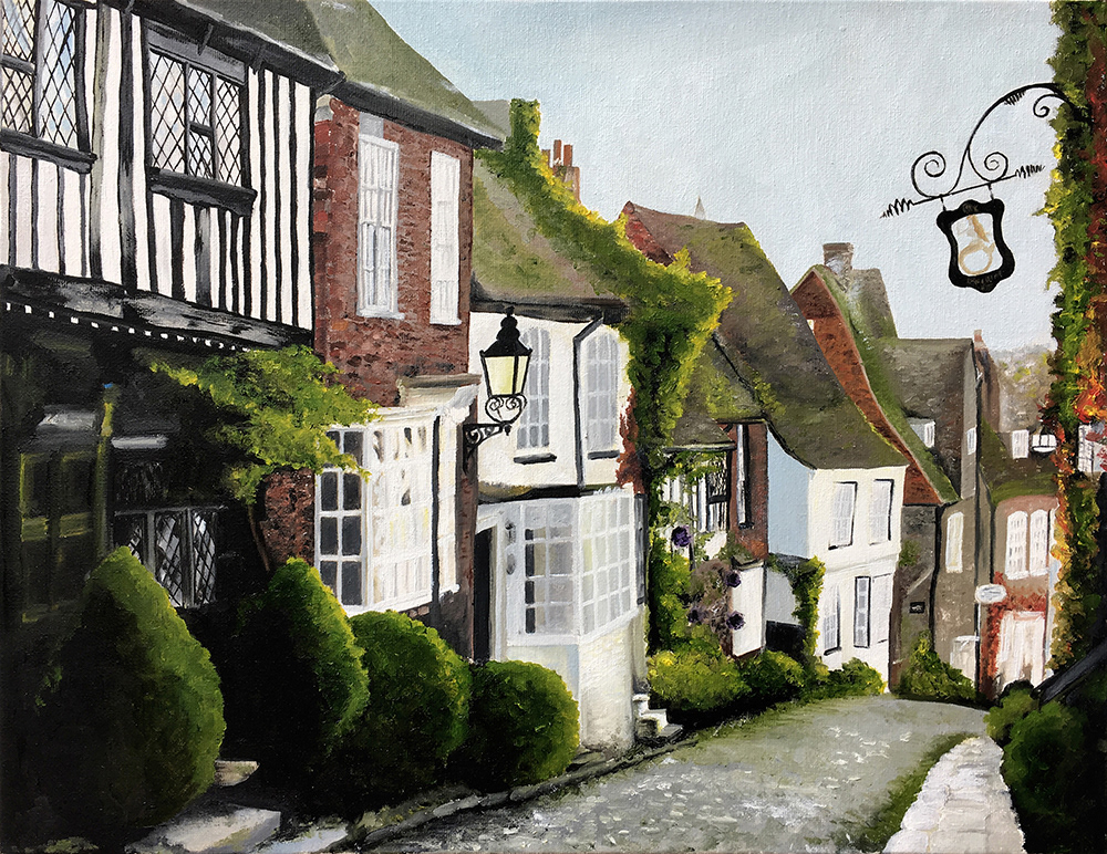'Mermaid Street' an oil painting of the little cobbled street in Rye, East Sussex by Edenbridge Artist Emma Miller at Little Gem Studio.