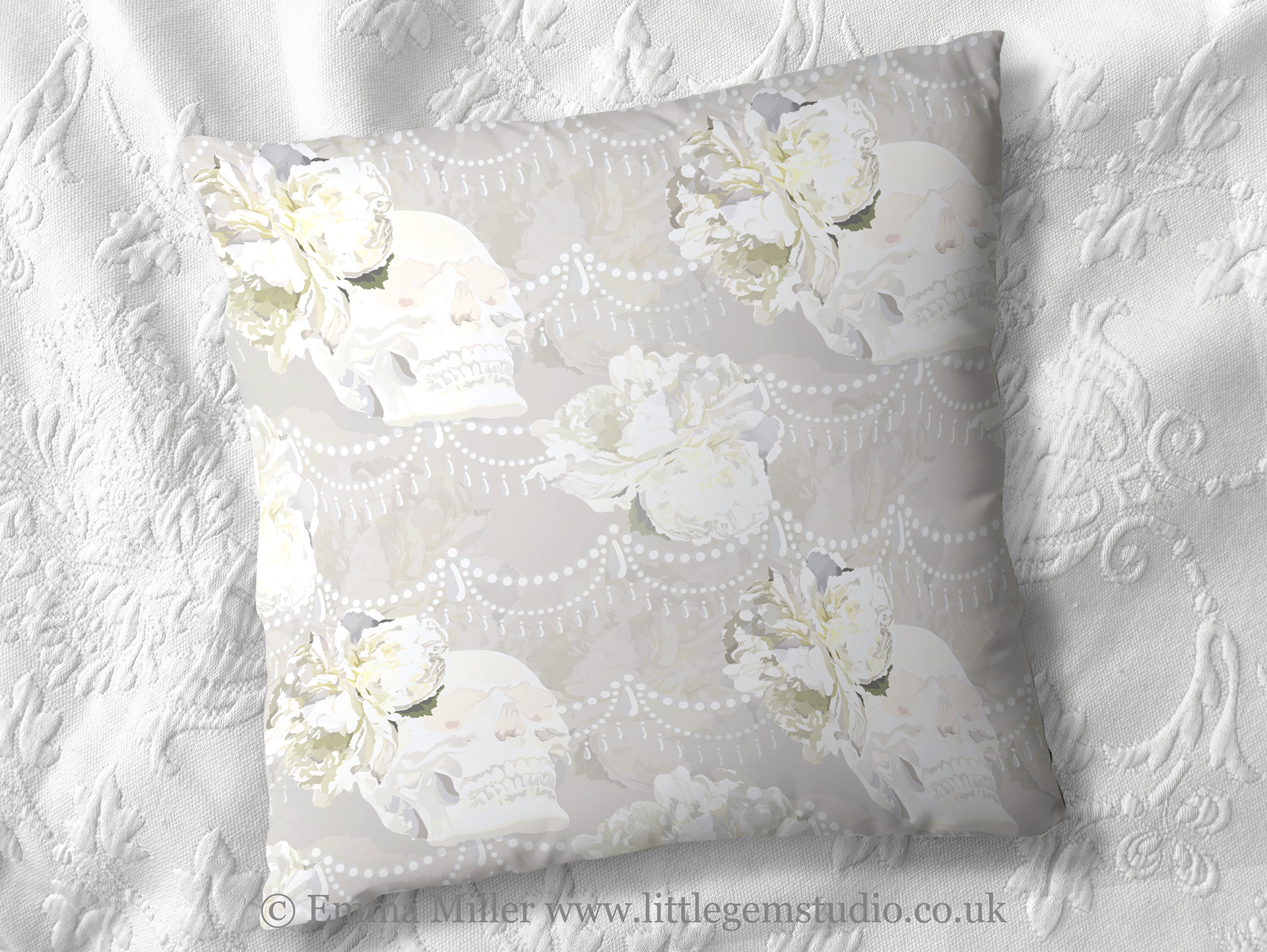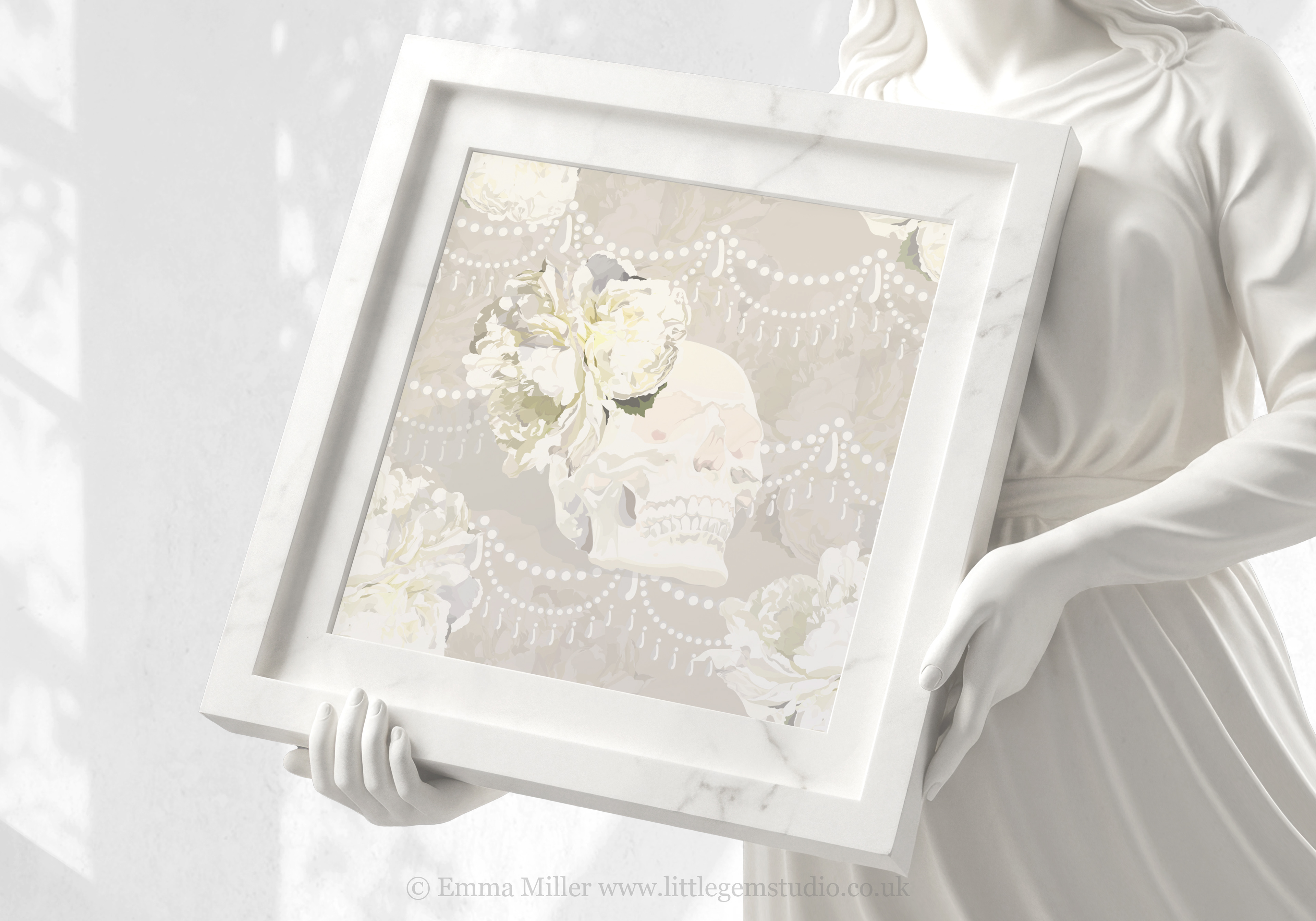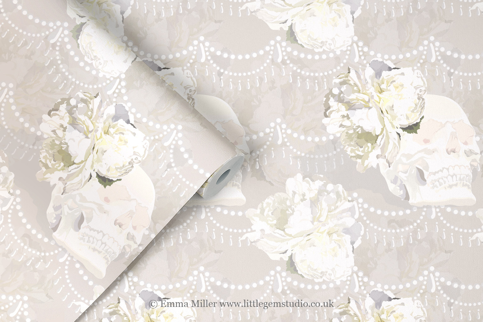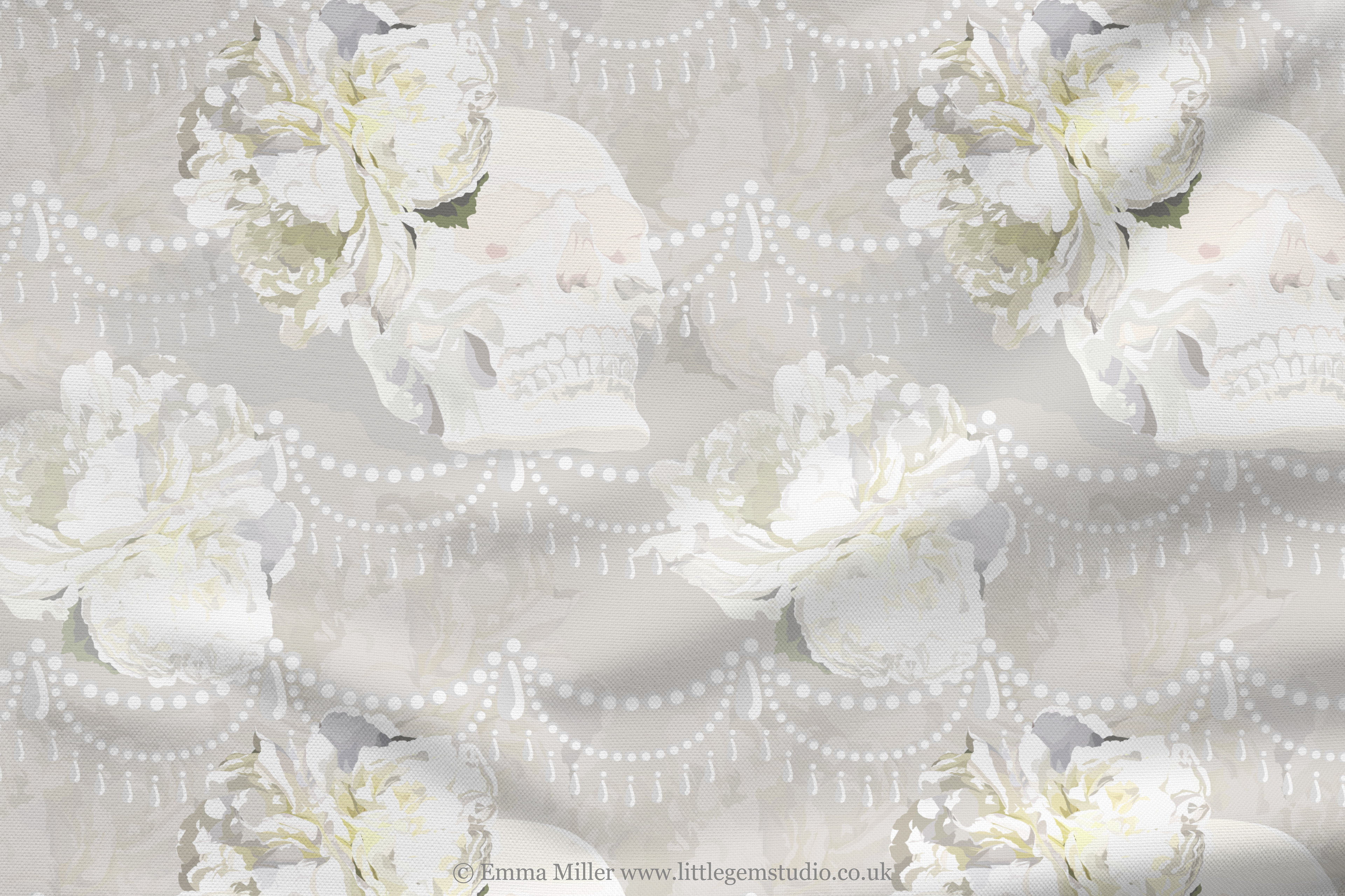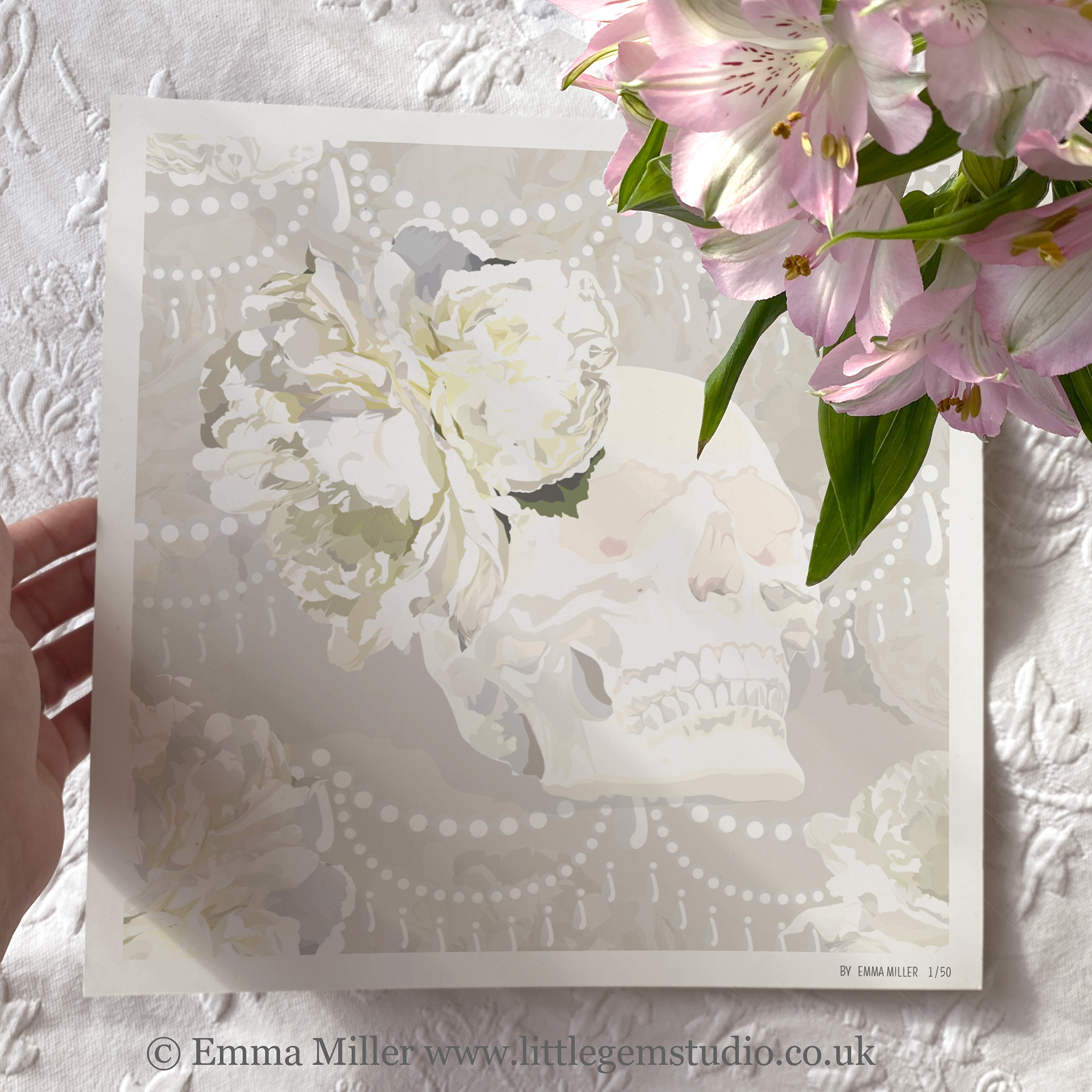 The warm hues come from the sunshine that was streaming into the gallery window that day, and I think they compliment the peonies perfectly! The pearl motif is from my more simple 'Amelie' design, but layered over the peony backdrop it adds a real touch of extravagance to the print!