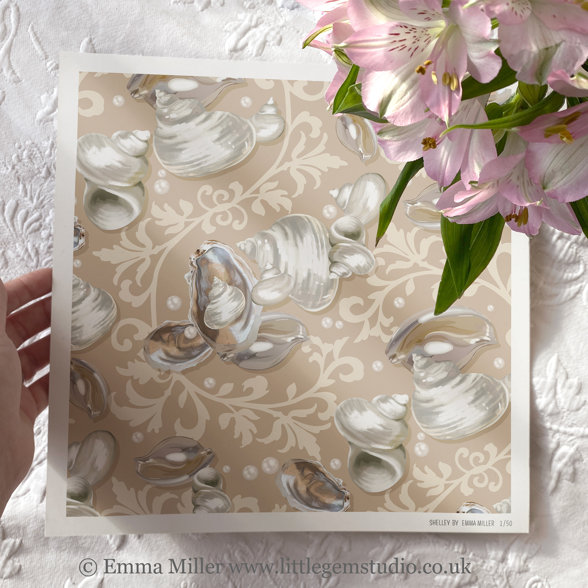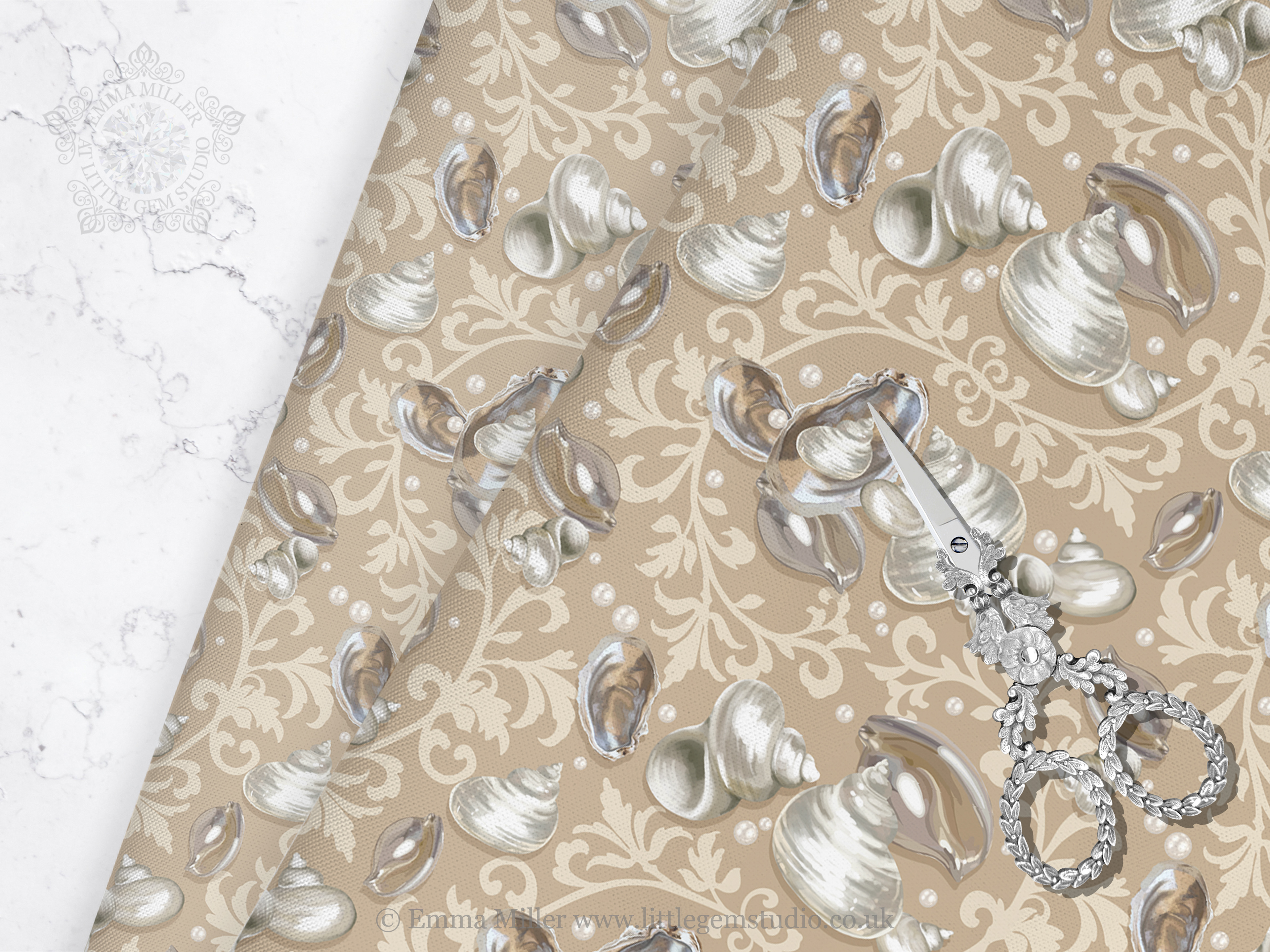 A delicate and detailed shimmering sea shells, meandering in scrolled gulleys create a calming and dainty pattern from the beautiful jewellery of the sea. Each one carefully hand drawn to captured the texture of the pearlescent mother of pearl, gorgeously shining with reflected light. This pattern reminds me of happy times by the sea, from Devon and Cornwall, to the Kentish coast and even the Greek islands or the Maldives. Every stretch of wild coastline has it's charm, and memories of happy times evoke a sense of calm and peacefulness.