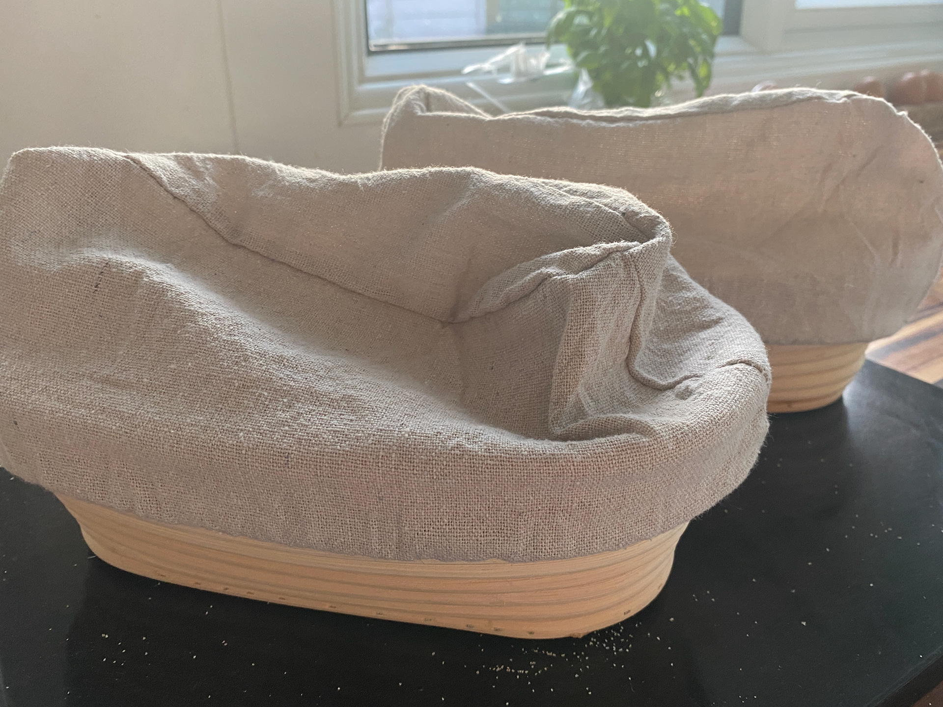 Use your dough scraper to scooch the flour under the dough, then scoop each one into a banneton.