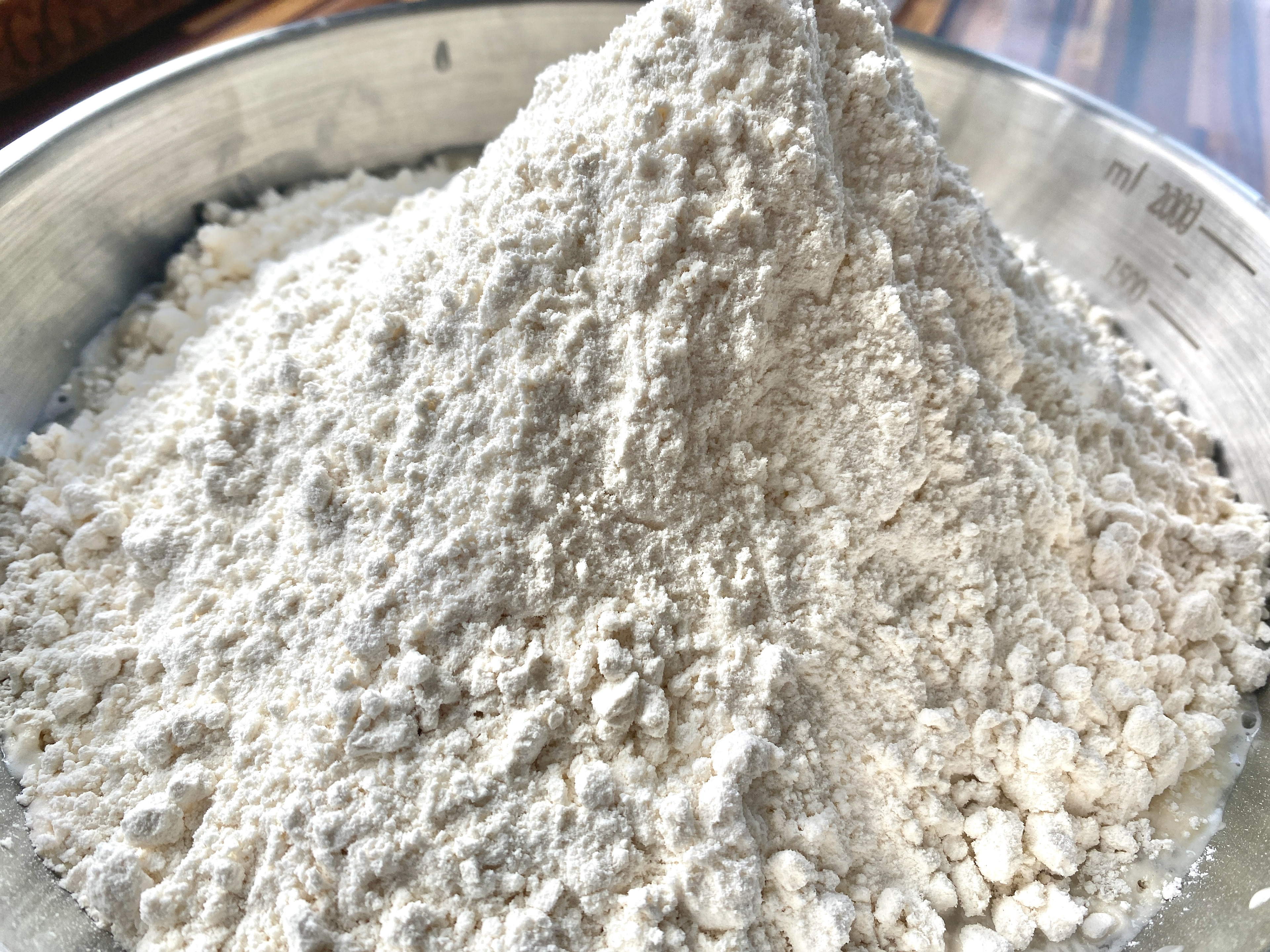 Adding the dry on top of the wet helps avoid unmixed flour at the bottom of the bowl.