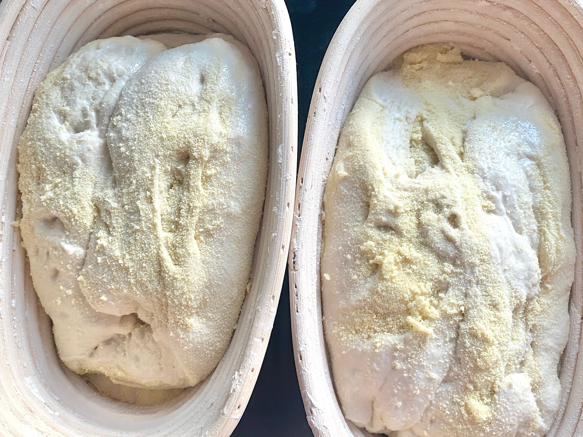 Repeat the folding process once more, then halve the dough and shape into rounds. Dry the surrounding worktop then dredge with flour or fine semolina. Add a little to your bannetons too.